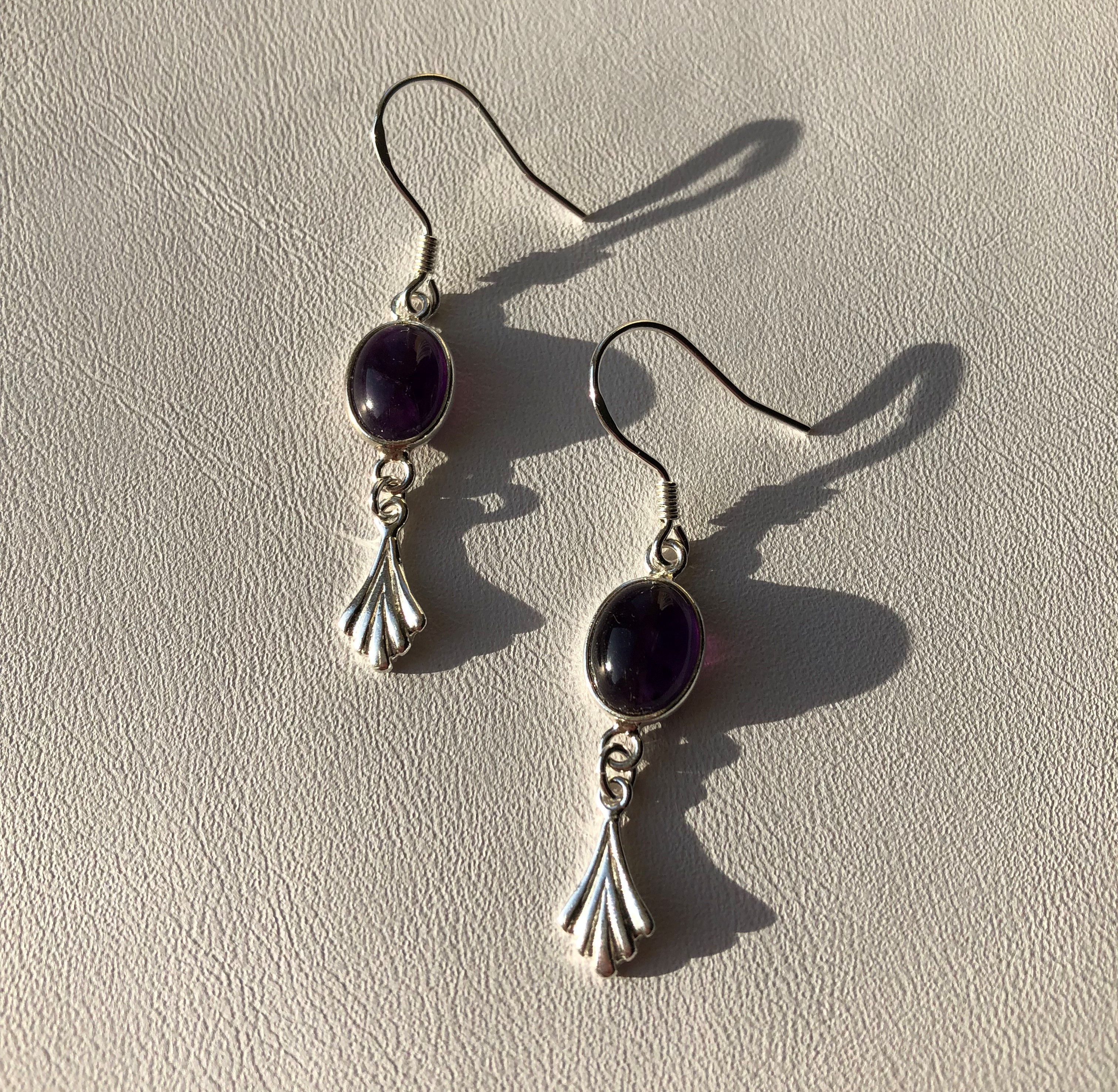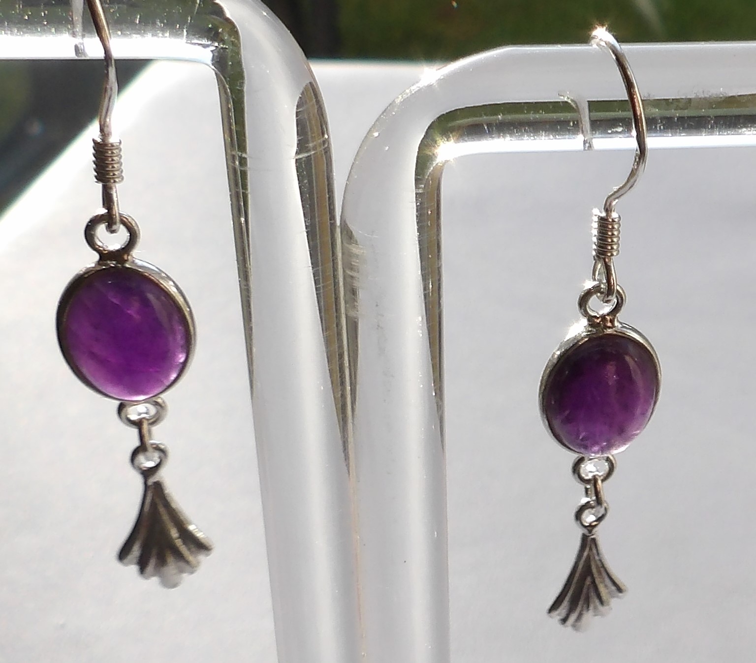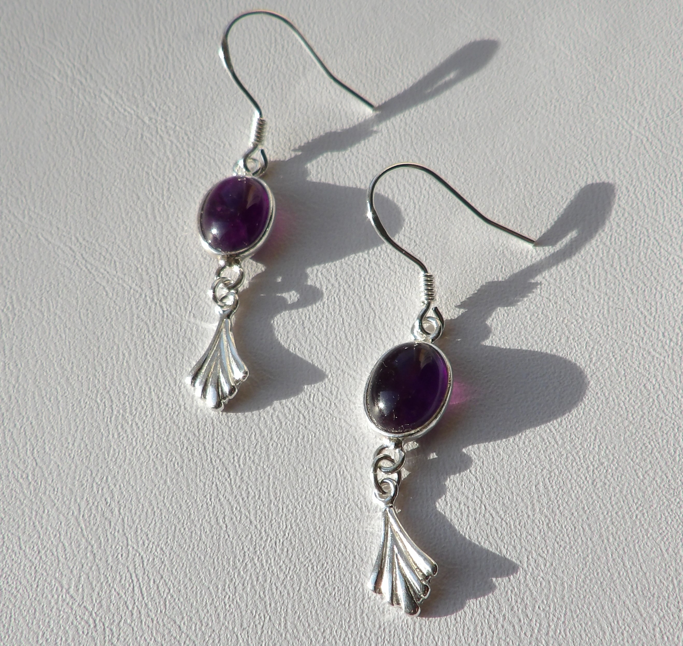These earrings are made with amethyst ovals set in sterling silver bezel connectors. I’ve attached sterling silver charms at the bottom to create a bit more “dangle”.