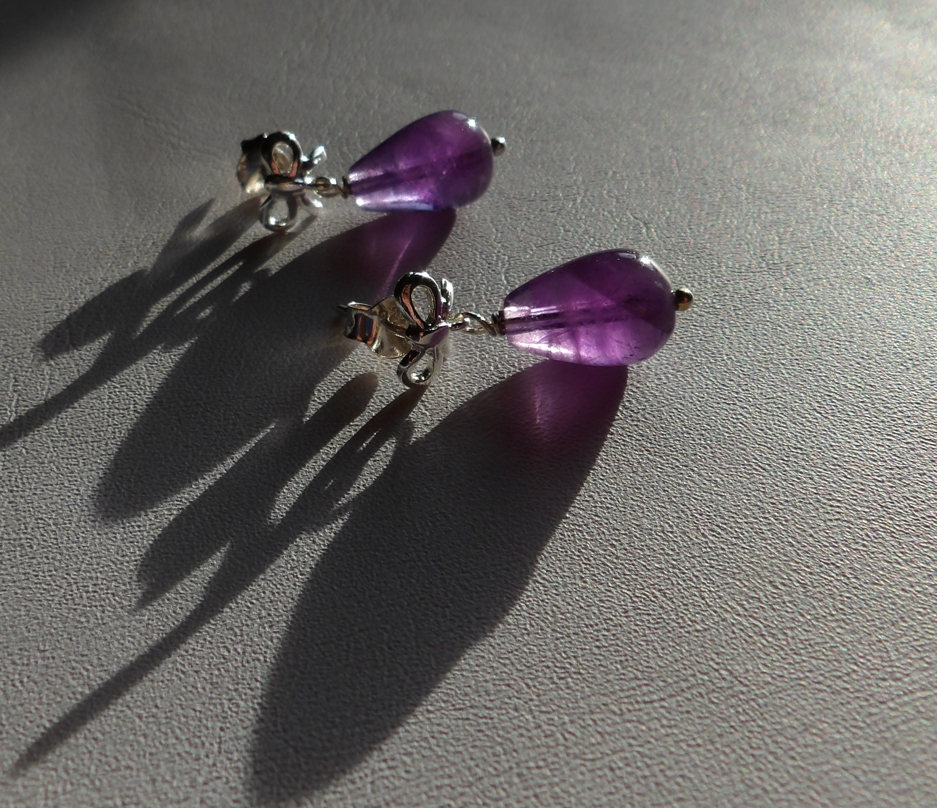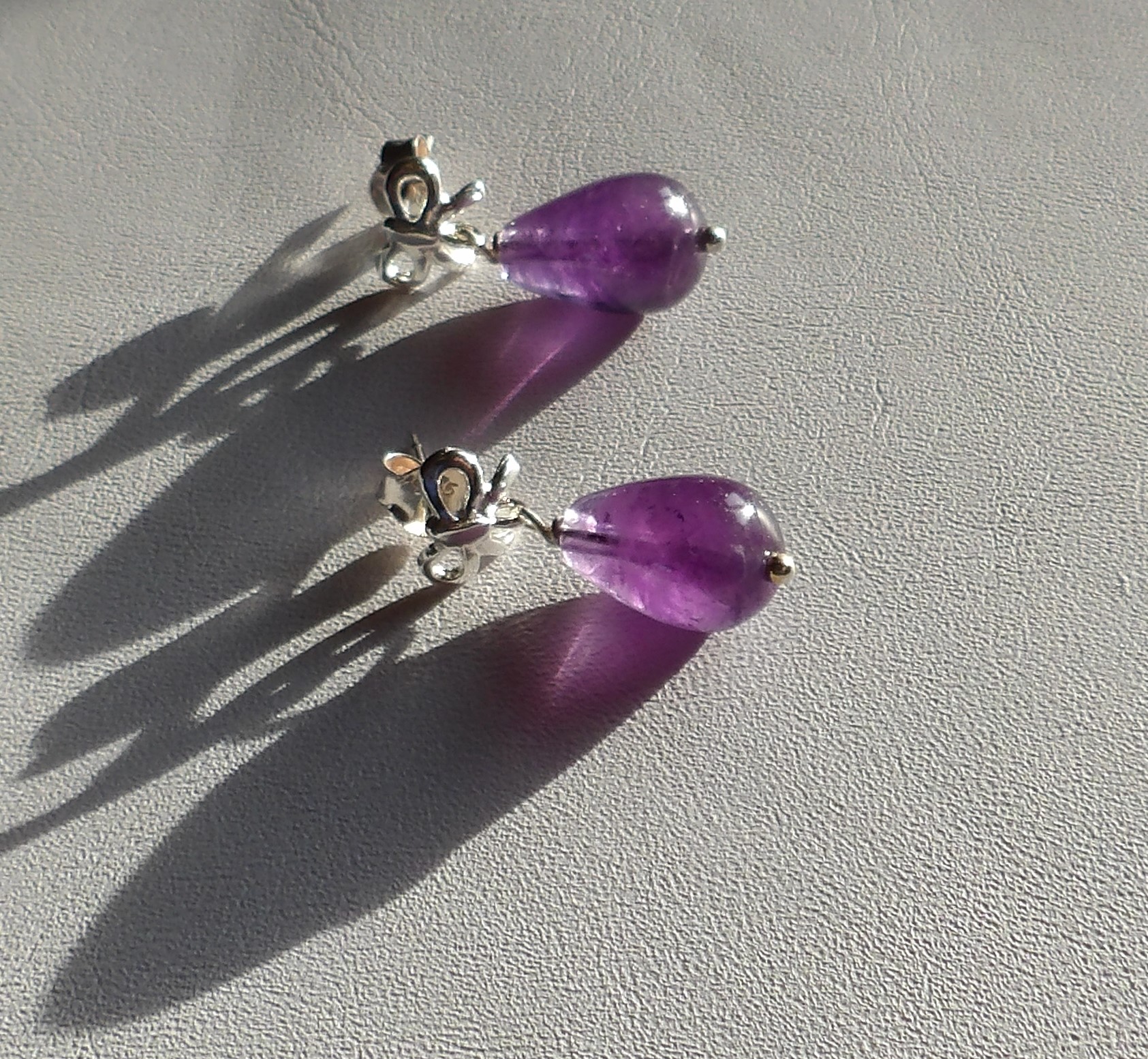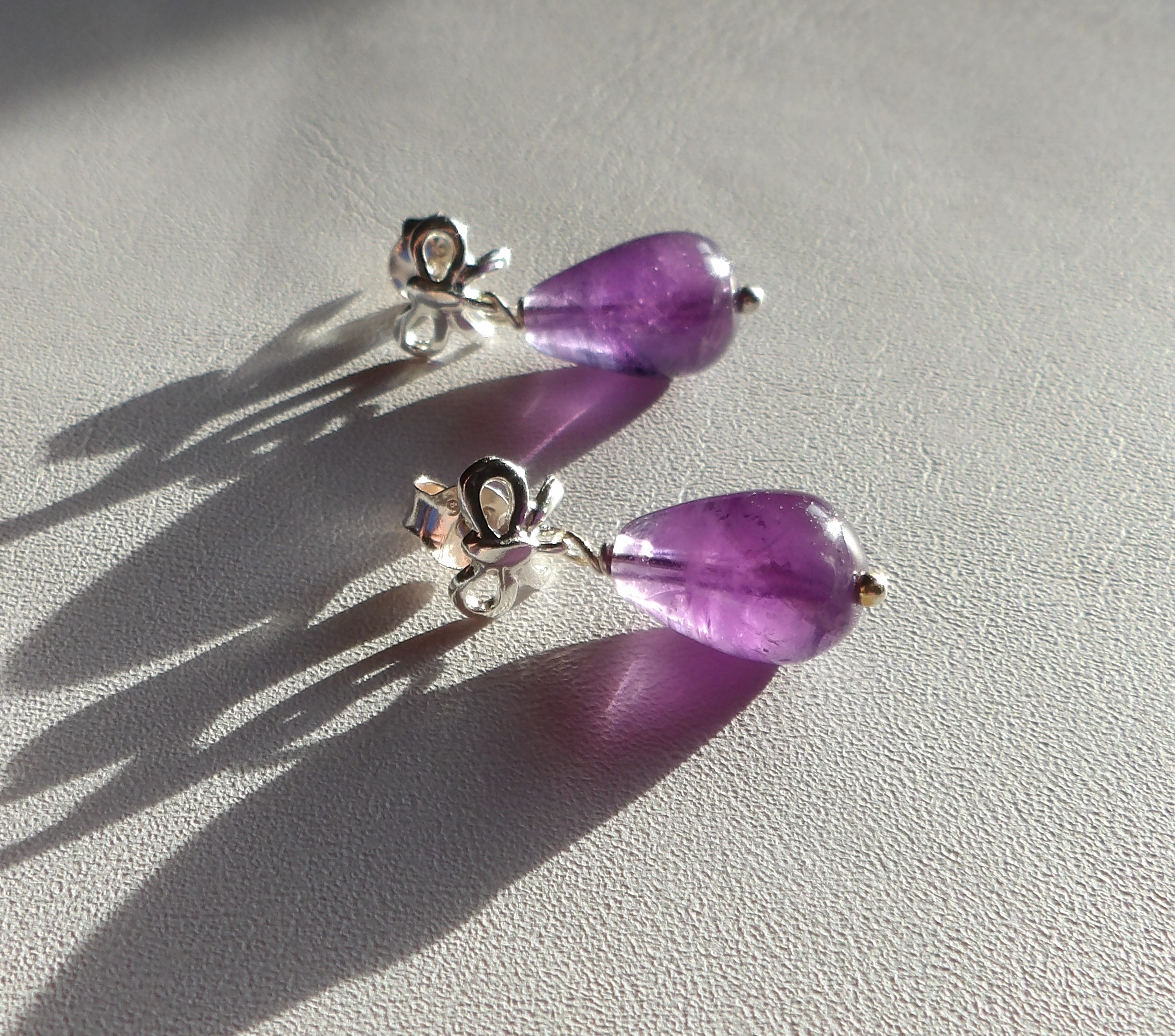 These lovely earrings are made with beautiful amethyst drops attached to pretty bow-shaped sterling silver earring posts.