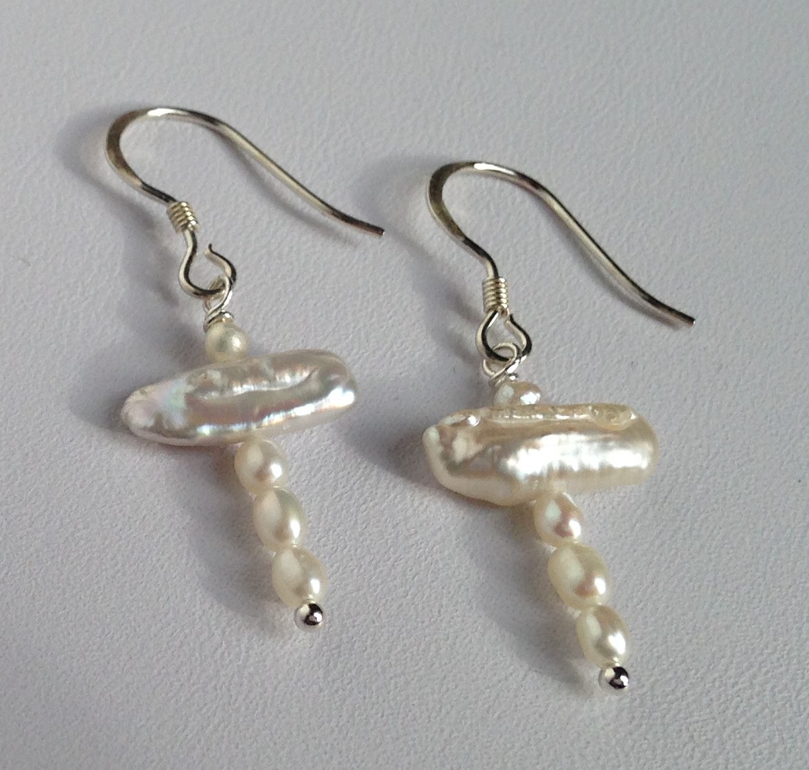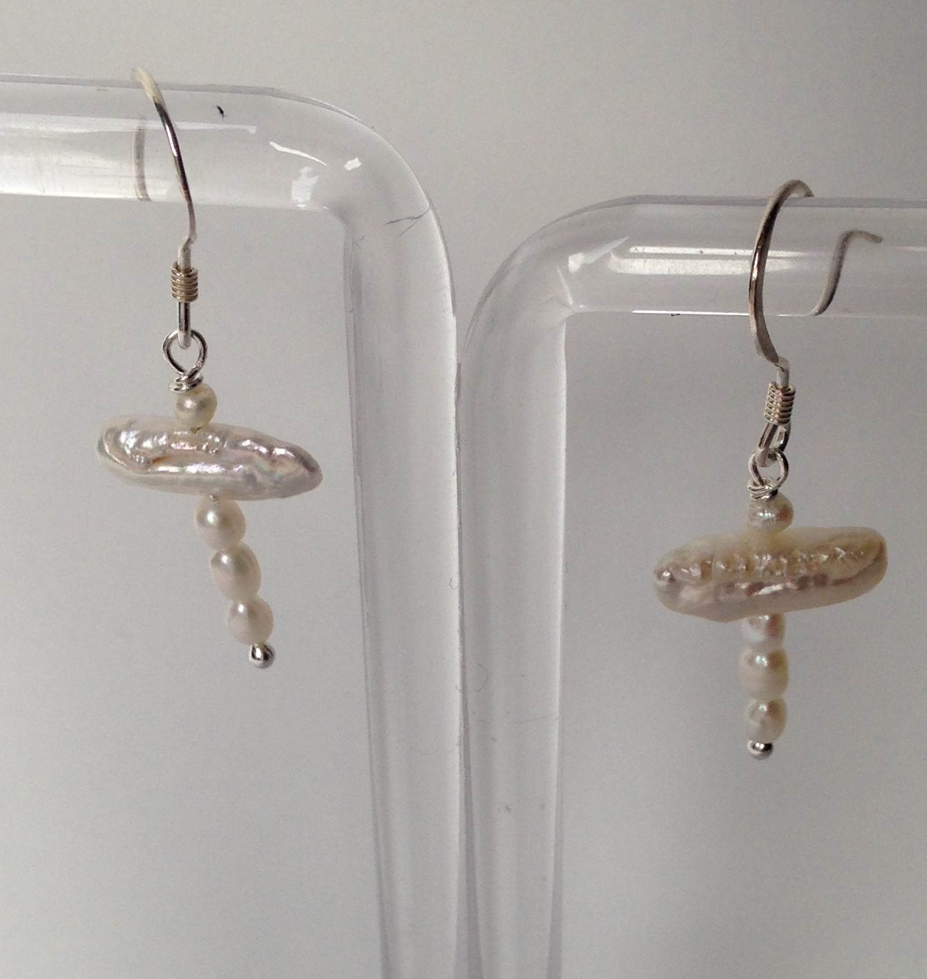 These earrings are made from two types of freshwater pearls – small rice pearls and centre-drilled keshi pearls. The earrings, which are finished with sterling silver shepherd’s hooks, look like dragonflies… or even crosses.