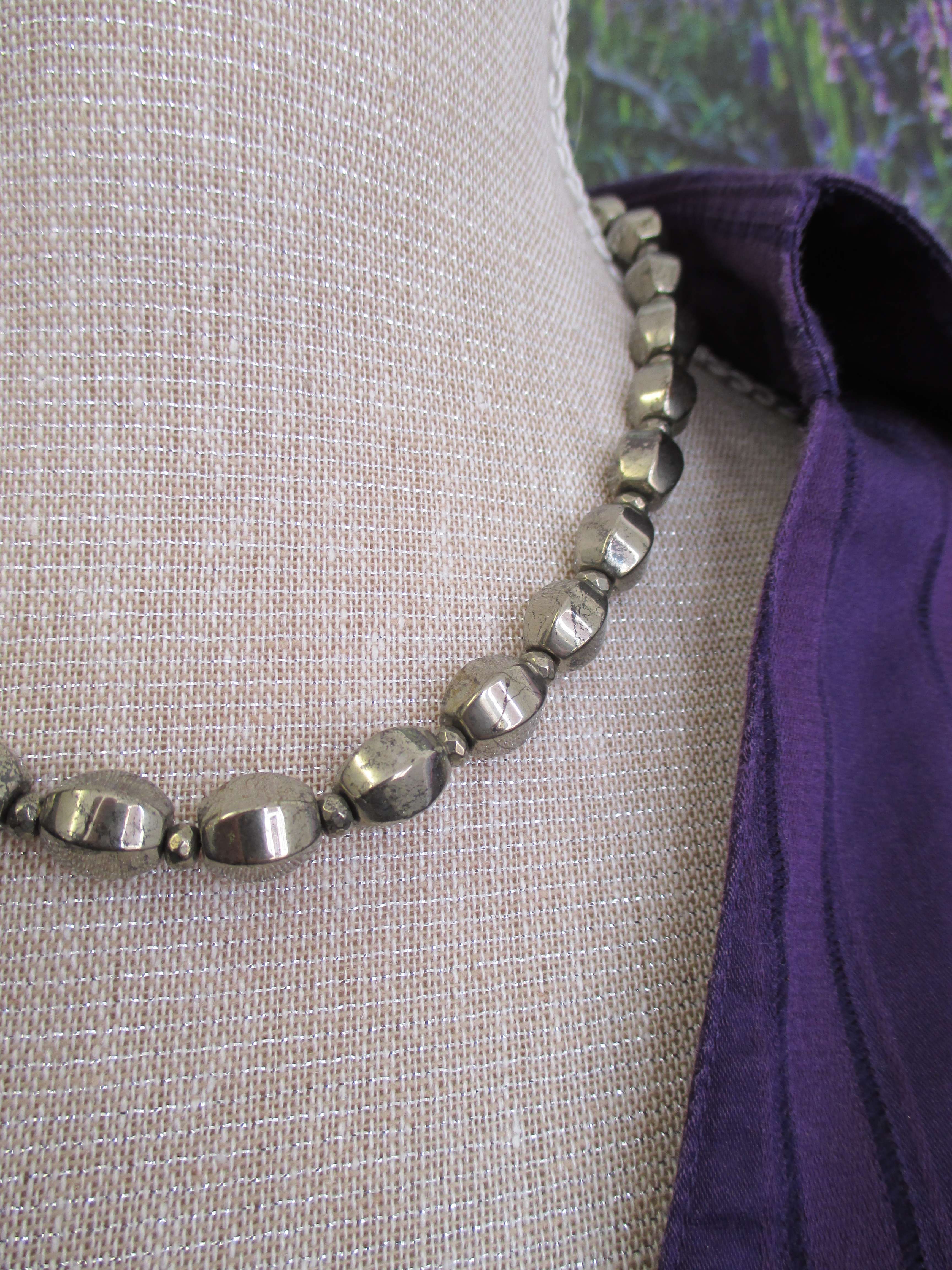 As pyrite is quite a weighty gemstone and I haven’t put any other gemstones with it, this necklace has a considerable carat weight. I’ve used faceted drums interspersed with faceted rondelles in this 18 inch long (45cms) necklace. This set would glam up any outfit.