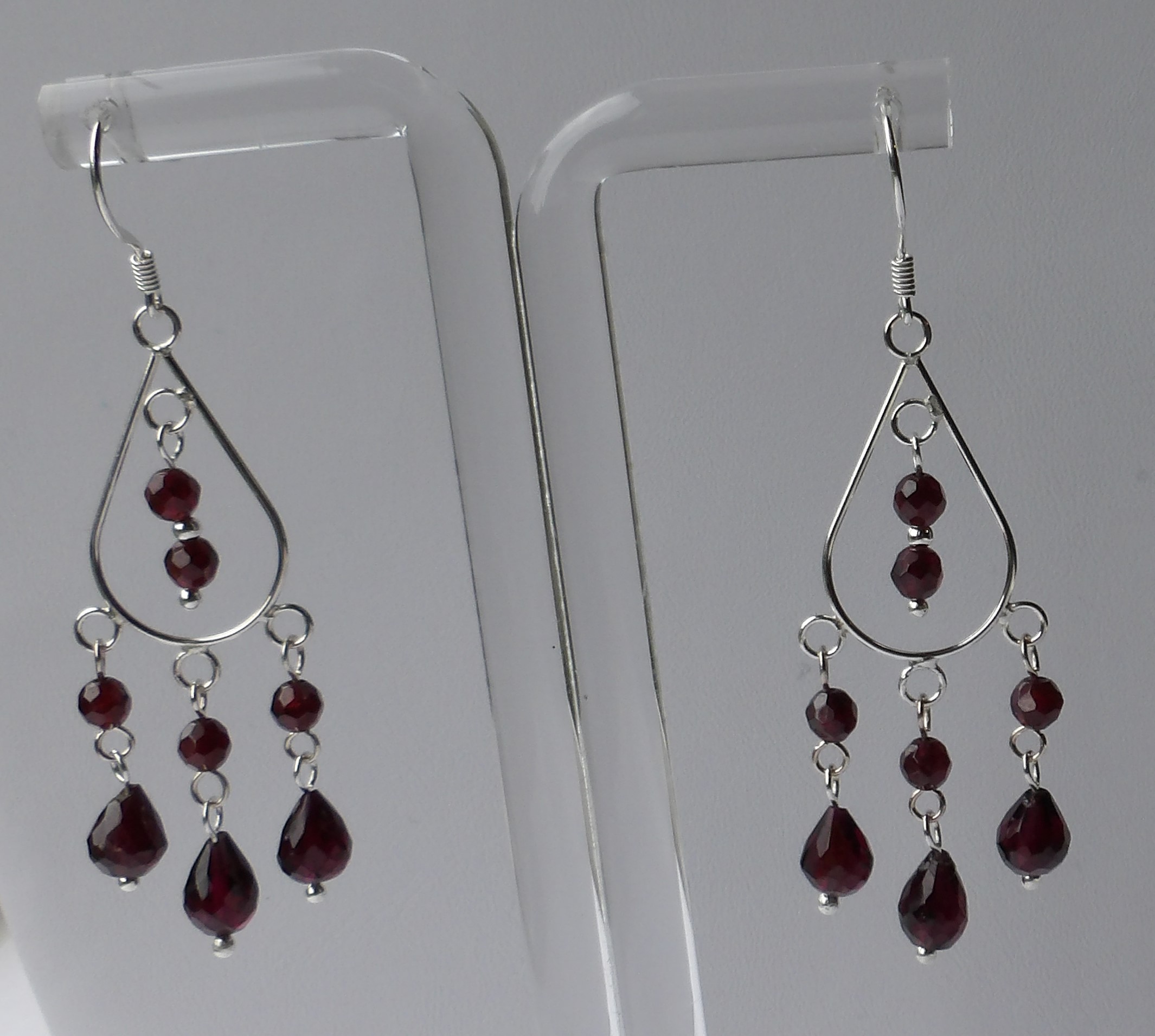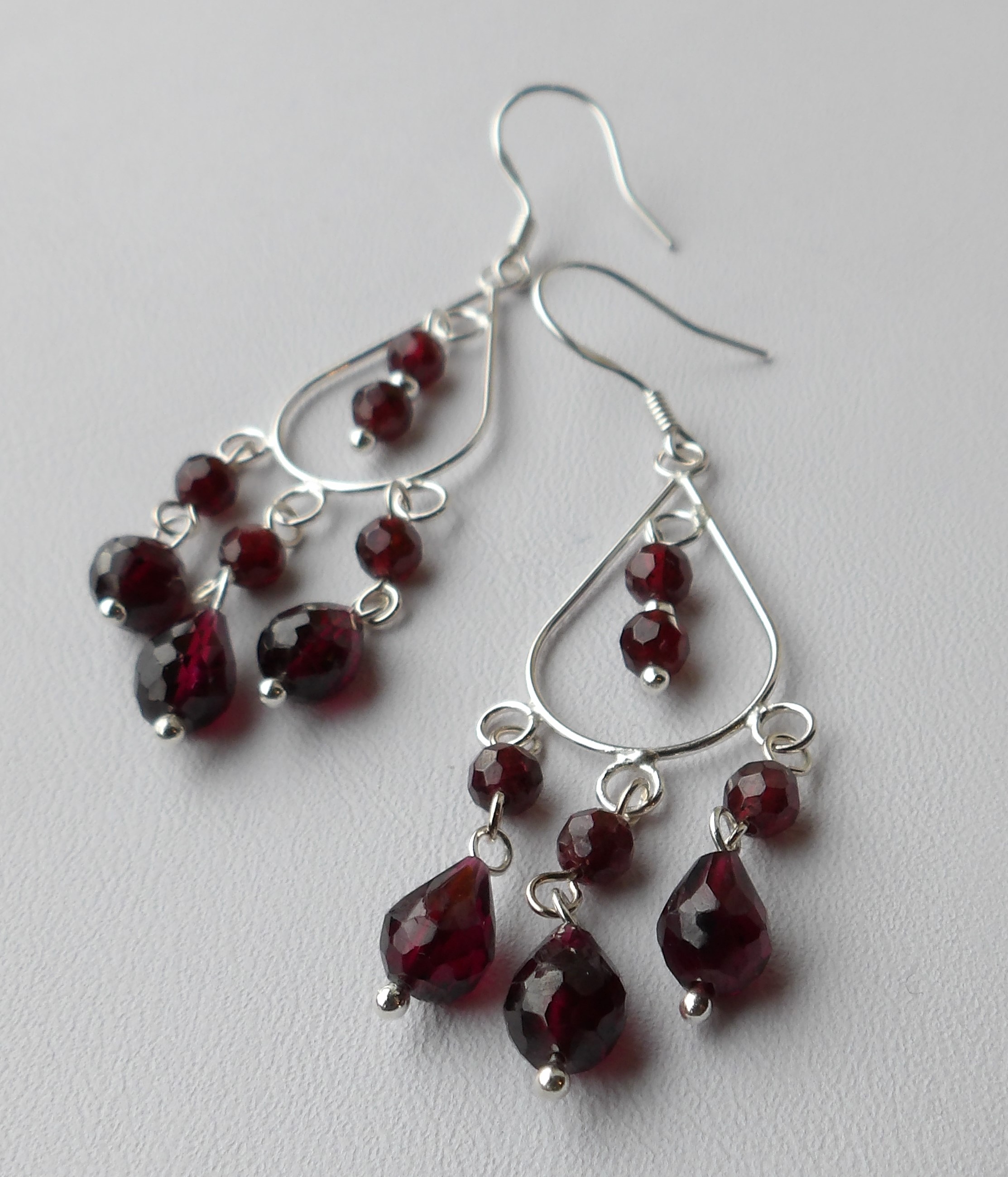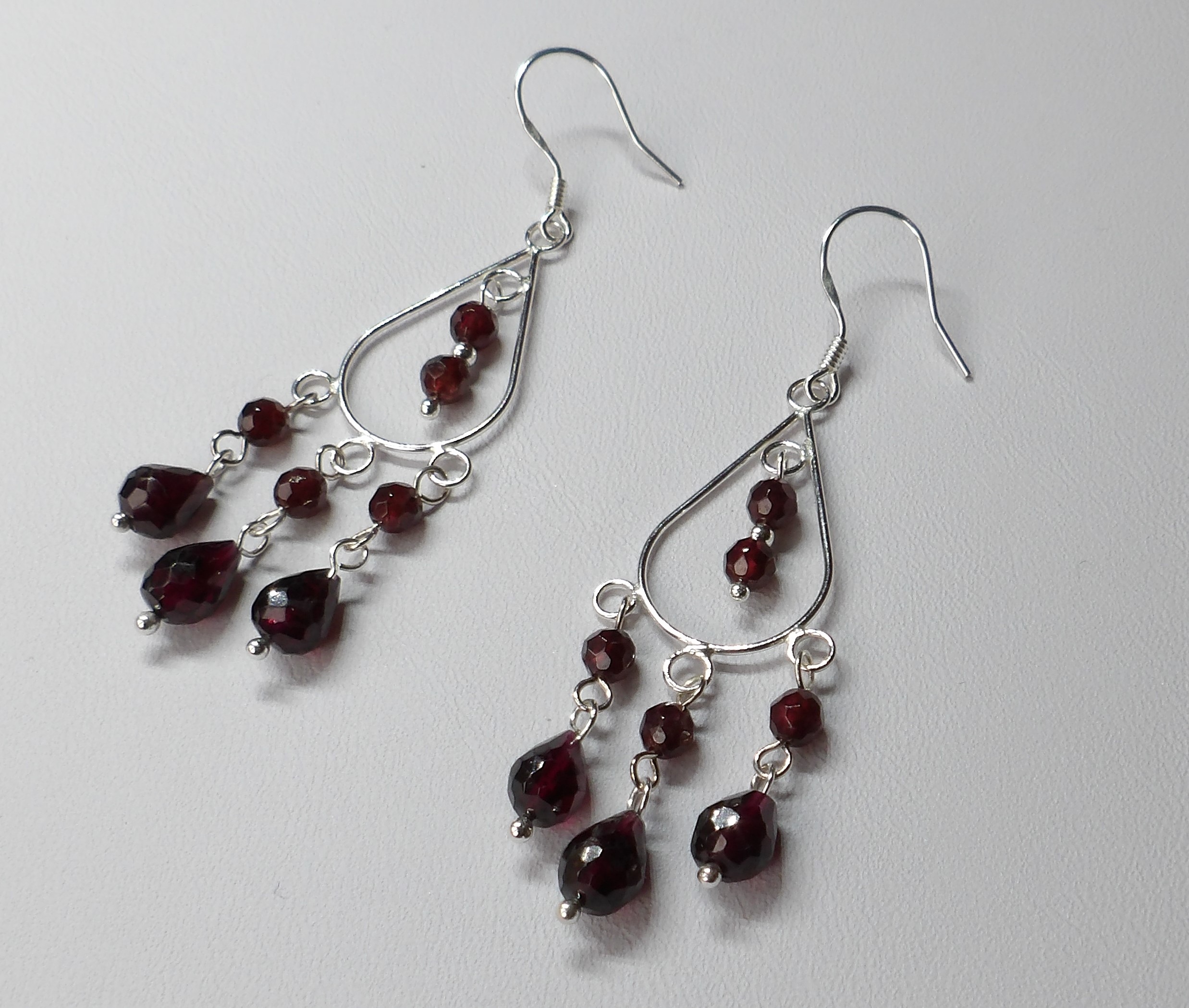 These beautiful chandelier earrings are made with faceted garnet beads – 4mm rounds and drops – and sterling silver.