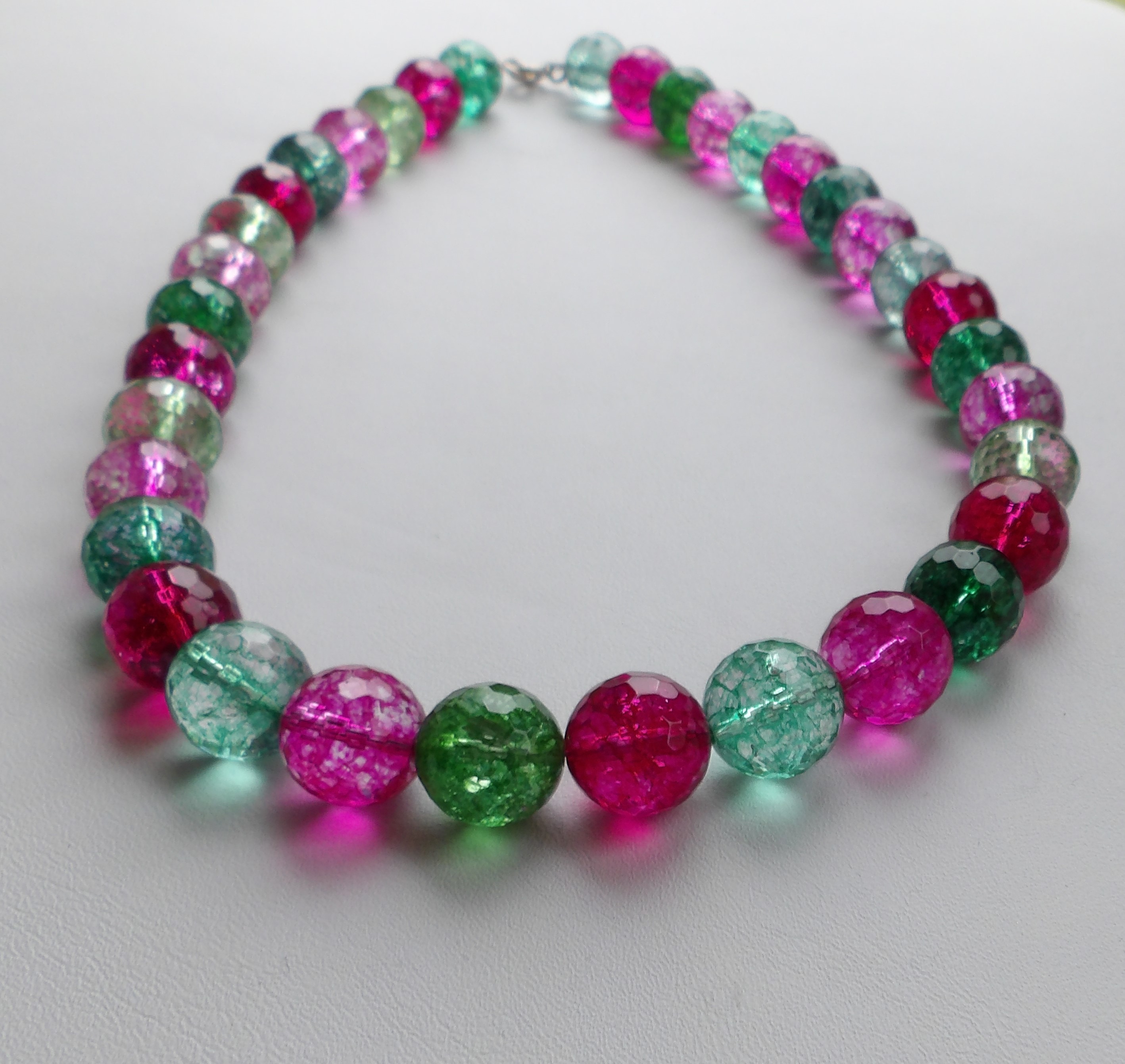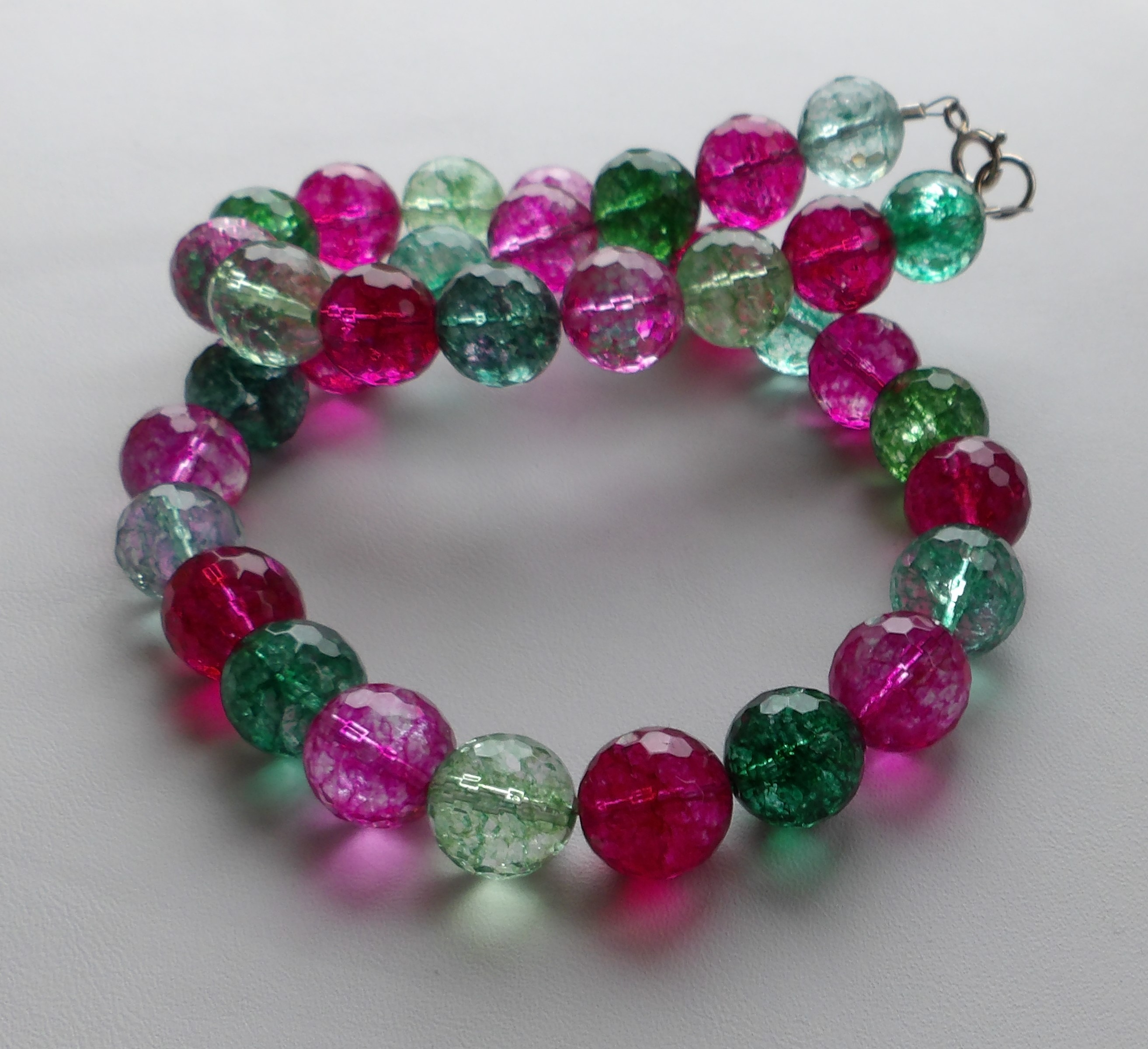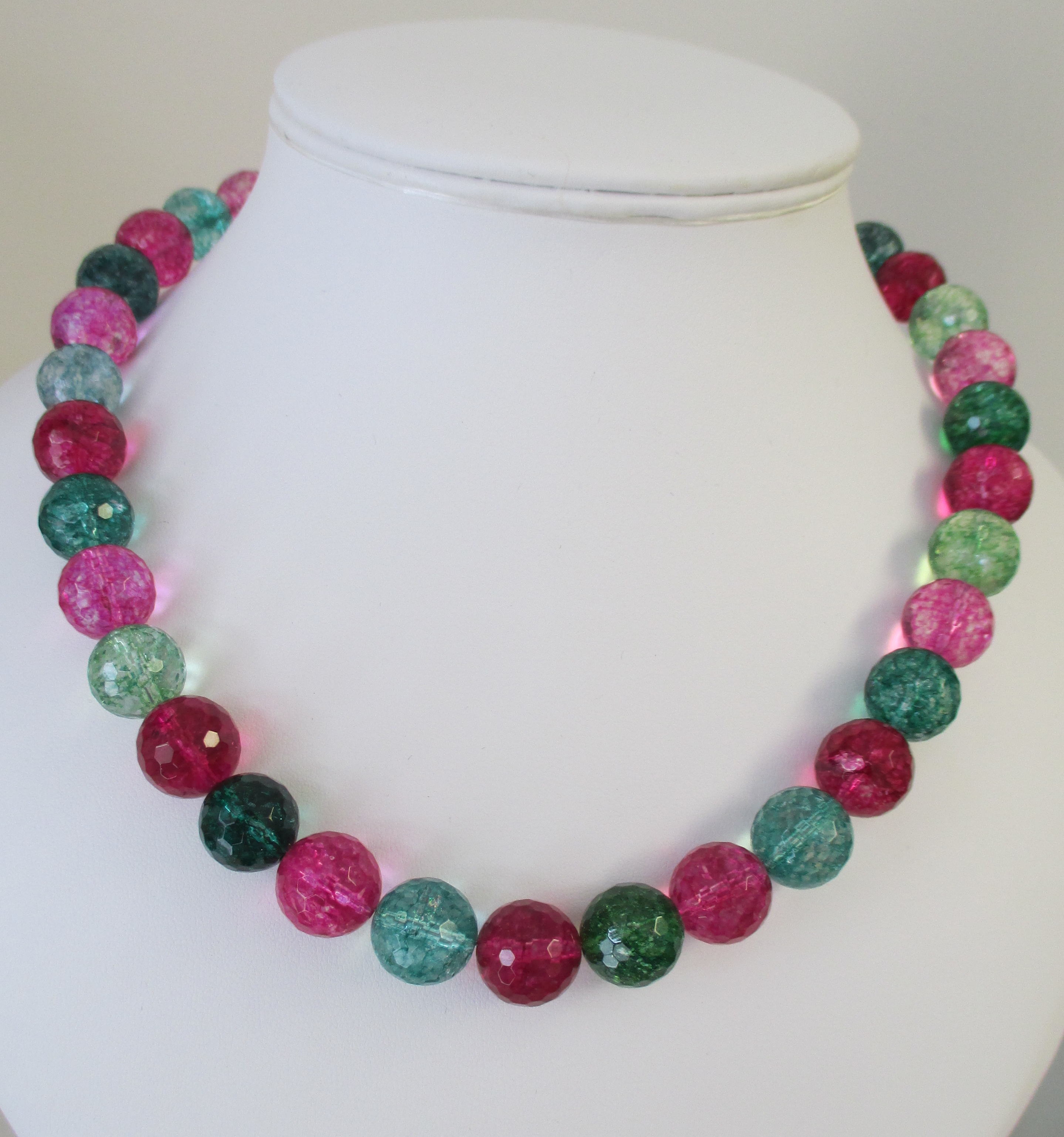This necklace is made with beautiful and sparkly (dyed) quartz in shades of greens/teal and pinks. The gemstones are 12-14mm faceted rounds and the necklace measures 18 inches (45 cms). It is finished with a sterling silver bolt ring clasp. Matching earrings are available.