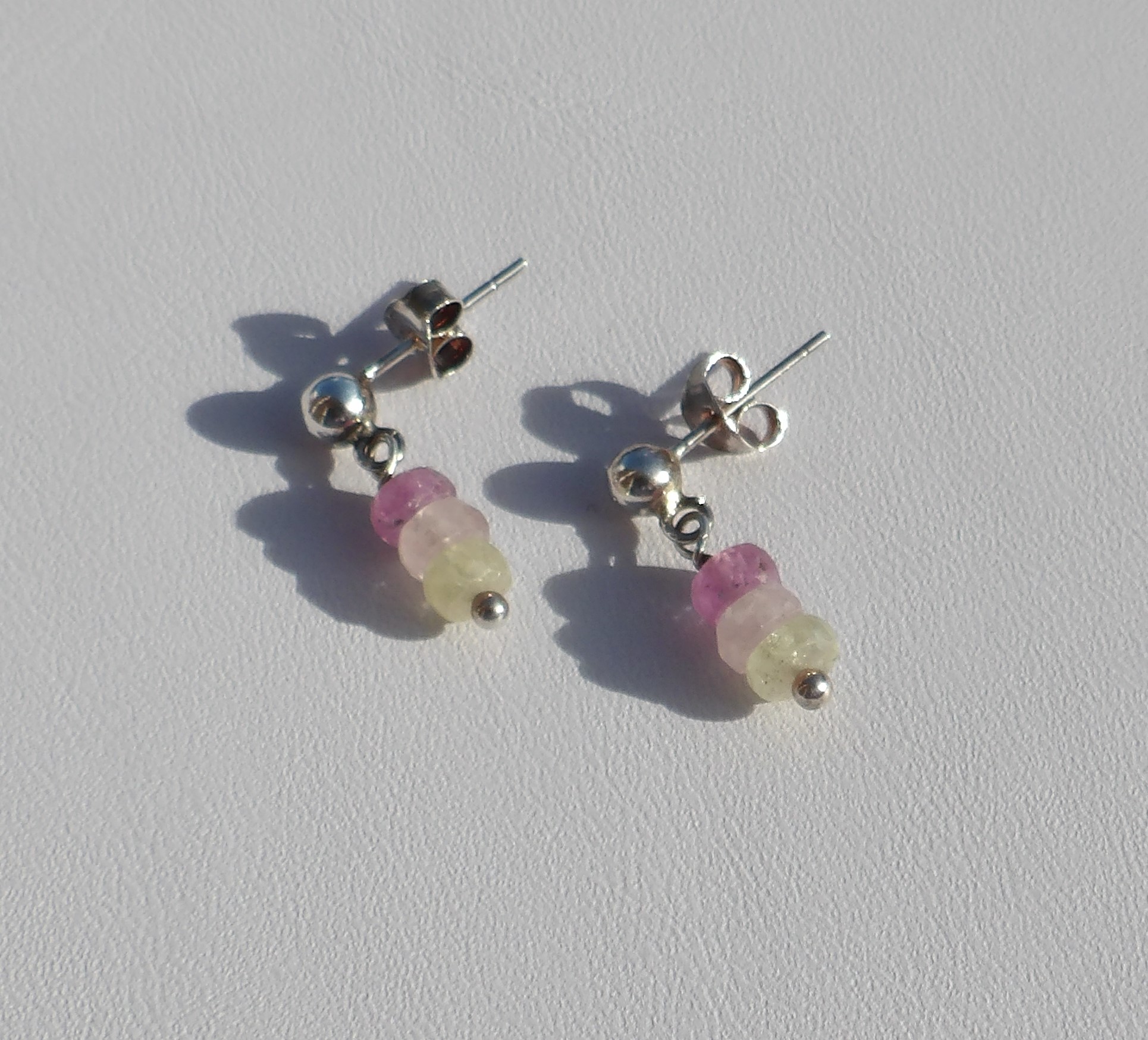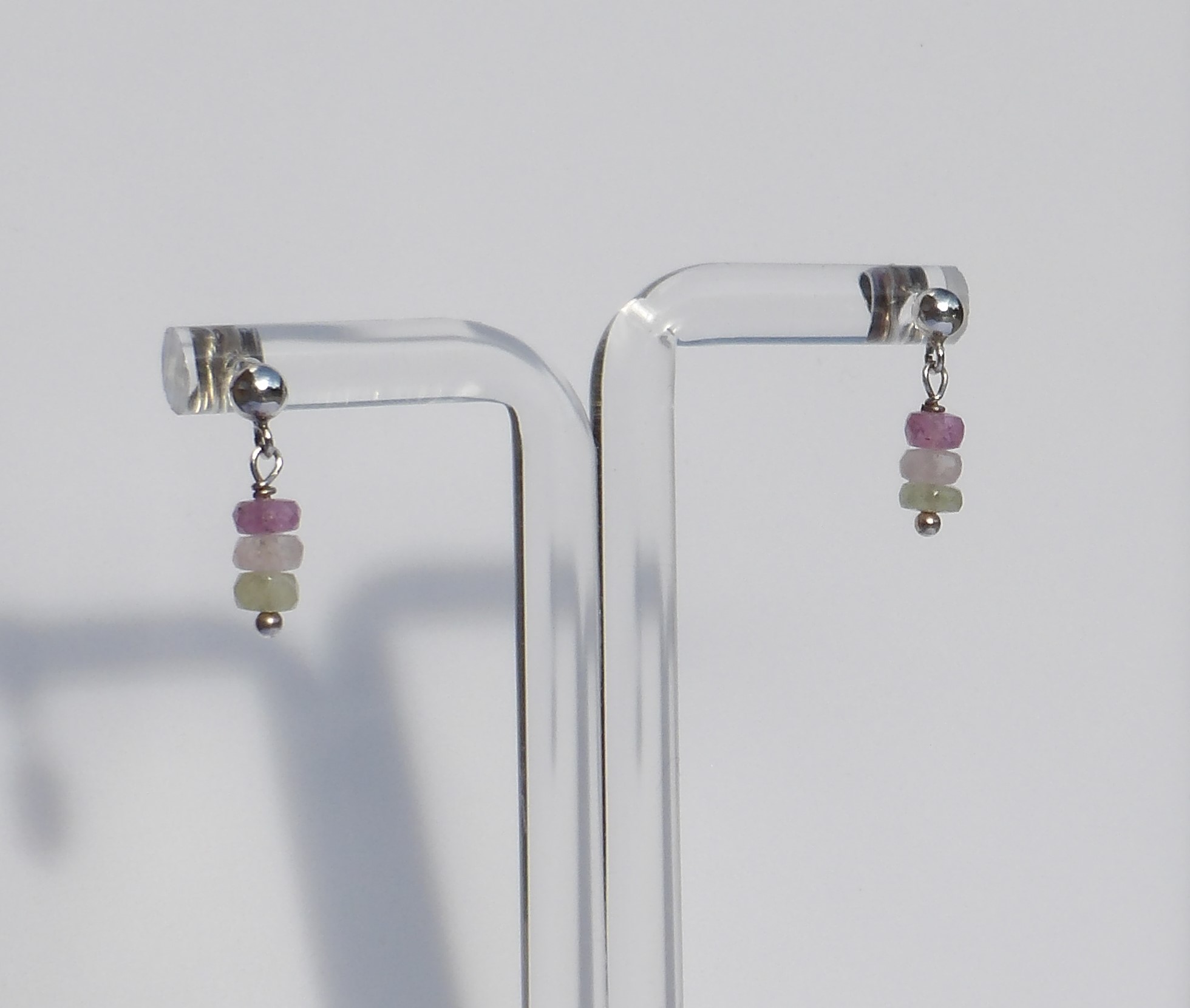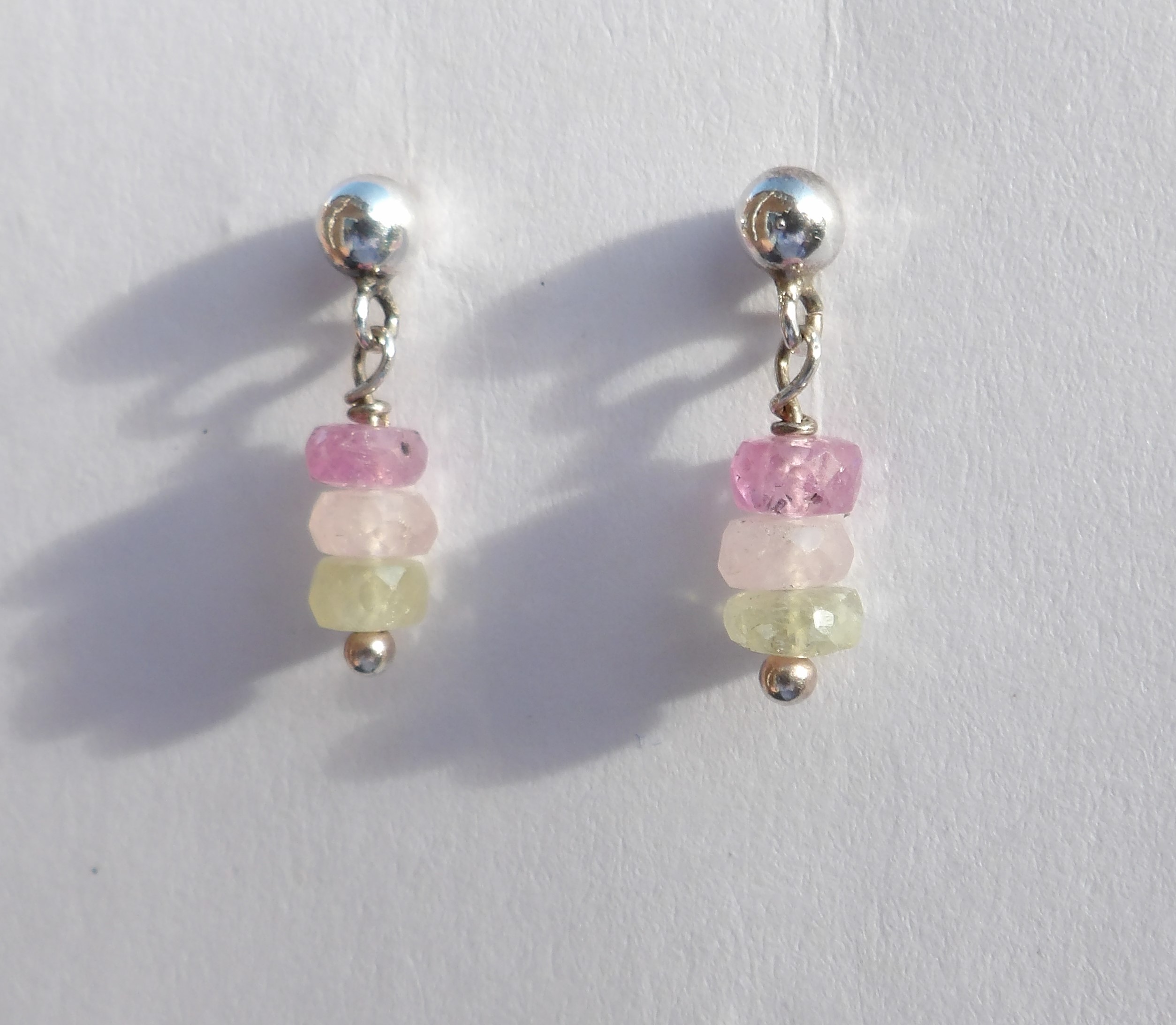 Blue sapphires are widely known, but September’s birthstone comes in a lot of different colours.These earrings are made with faceted sapphire rondelles in three different colours and finished with a sterling silver shepherd’s hook.