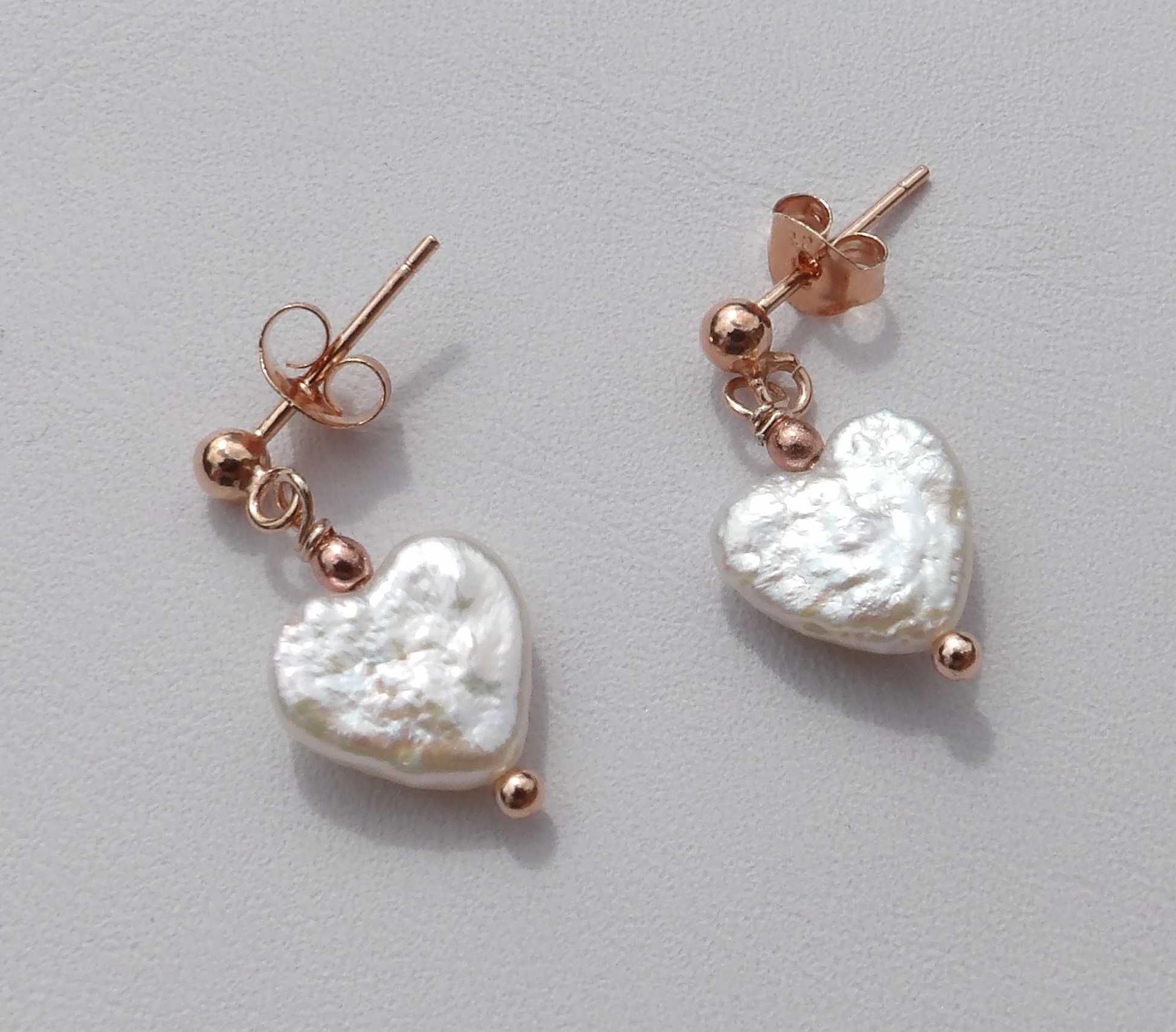 These pretty earrings are made with pearl hearts (9-10mm) and rose gold on sterling silver earring posts and tiny (2mm) round beads. The posts could be swapped with shepherd’s hooks. Matching necklace and earrings are available. (See extra photos)