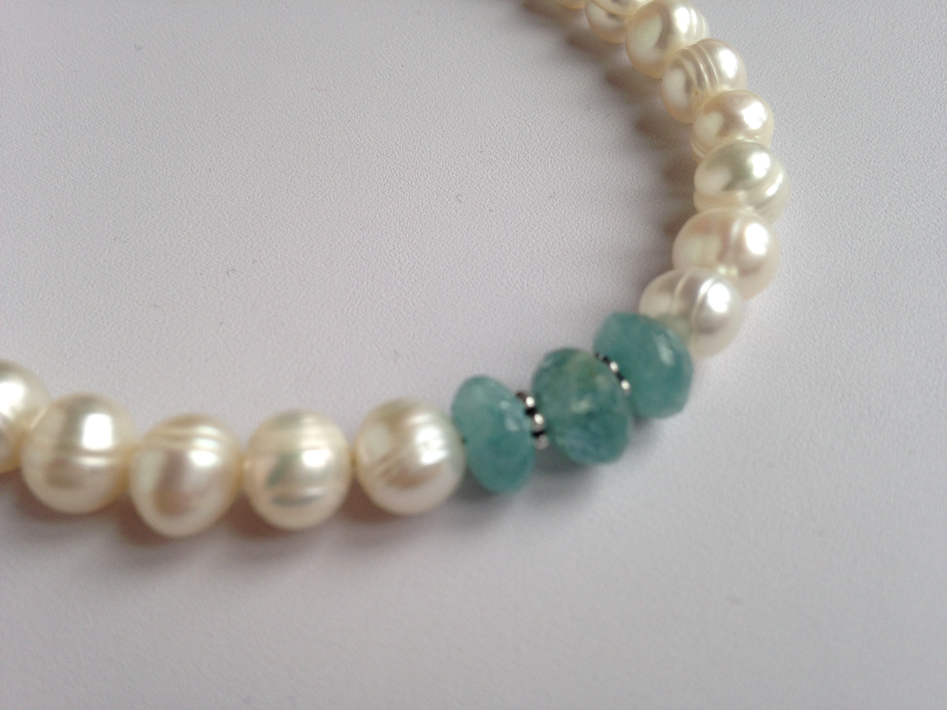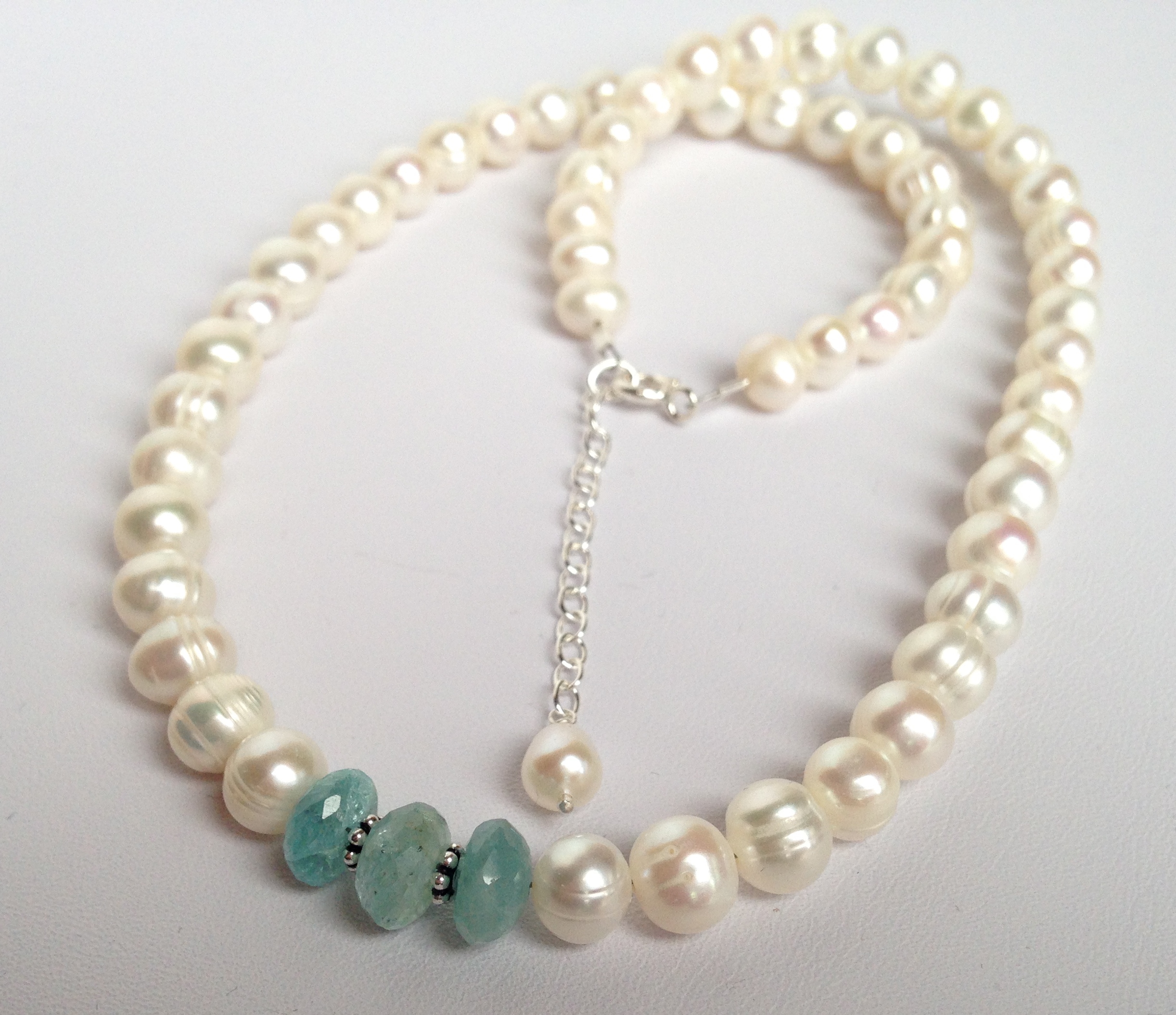 This necklace adds eye-catching detail to a classic pearl necklace. At the front of the necklace, I’ve added three beautiful faceted aquamarine rondelles and two sterling silver beads. The necklace is finished with a sterling silver bolt ring clasp and an extension chain which gives the necklace a length of 16.5-18 inches (42-46cms). Aquamarine, the birthstone for March, is a stone of serenity. It calms and soothes with its lovely blue-green colour. Aquamarine is believed to boost the immune system and to reduce stress. Pearl, June’s birthstone, is said to give the wearer a sense of calmness and to promote faith, loyalty, truth and purity. Pearls have been used throughout medical history to help treat disorders of the digestive tract, muscular systems and the skin. They are also believed to increase fertility as well as easing childbirth.