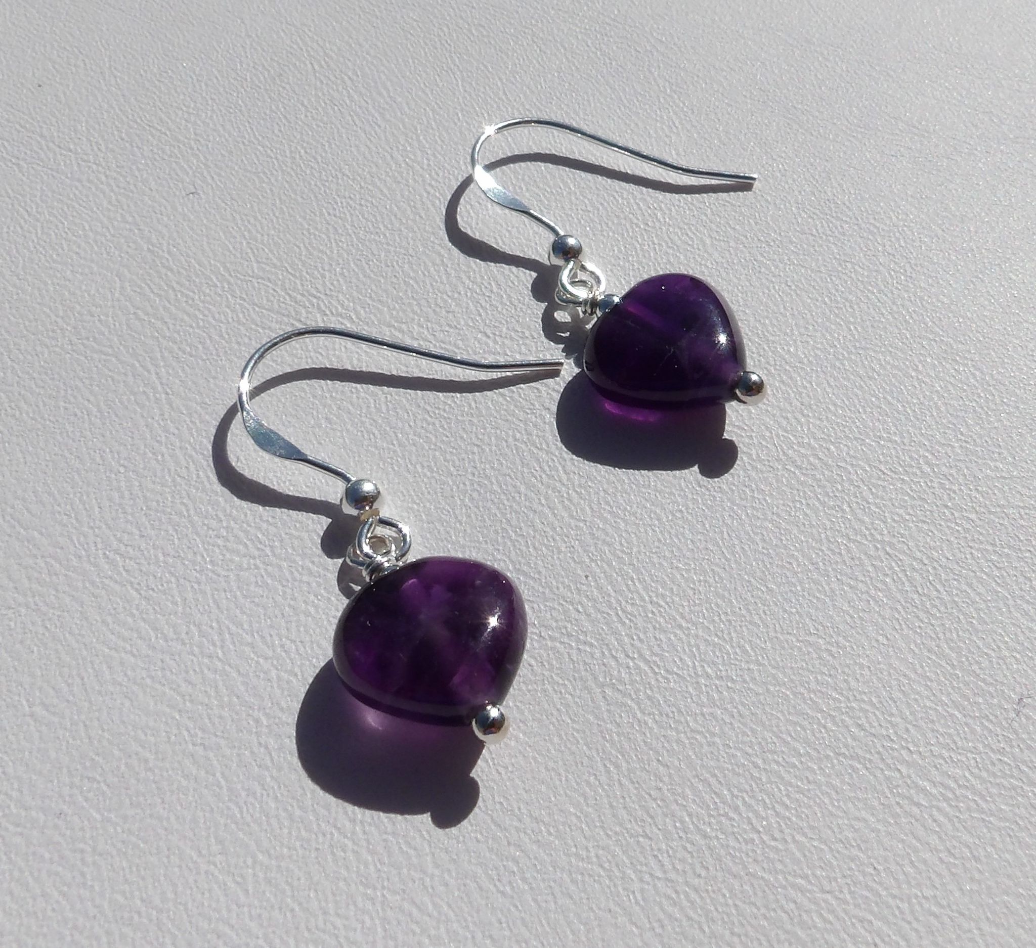These earrings are made with amethyst hearts and sterling silver findings, including a sterling silver bead.