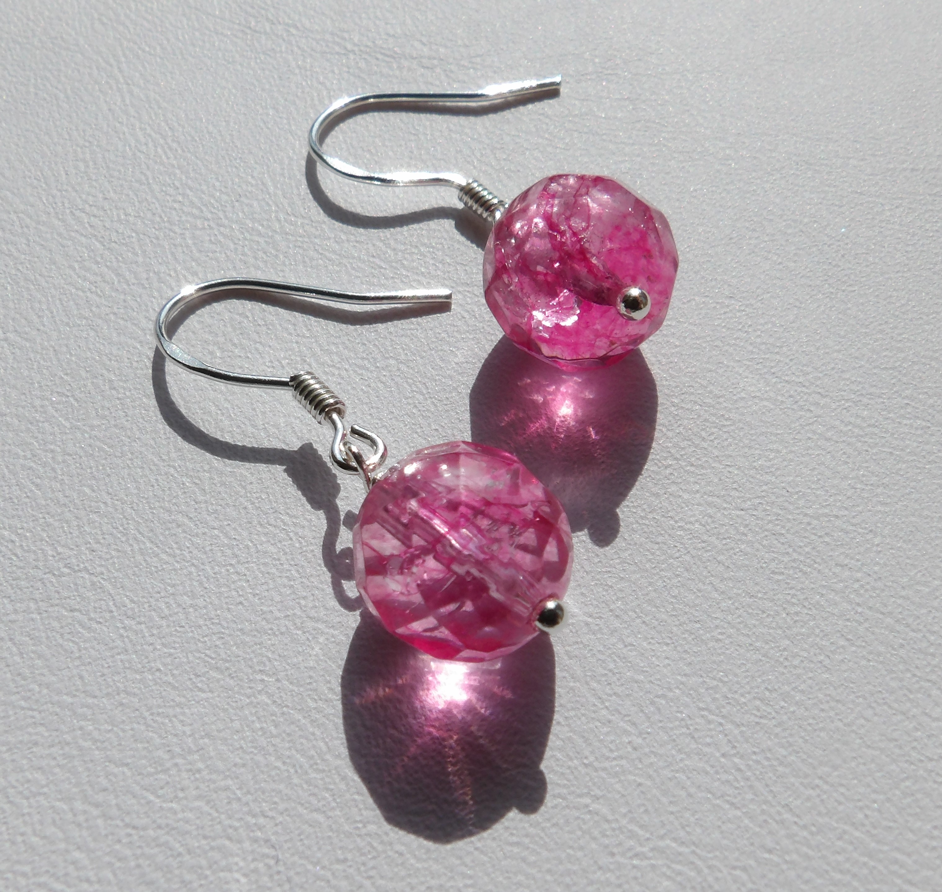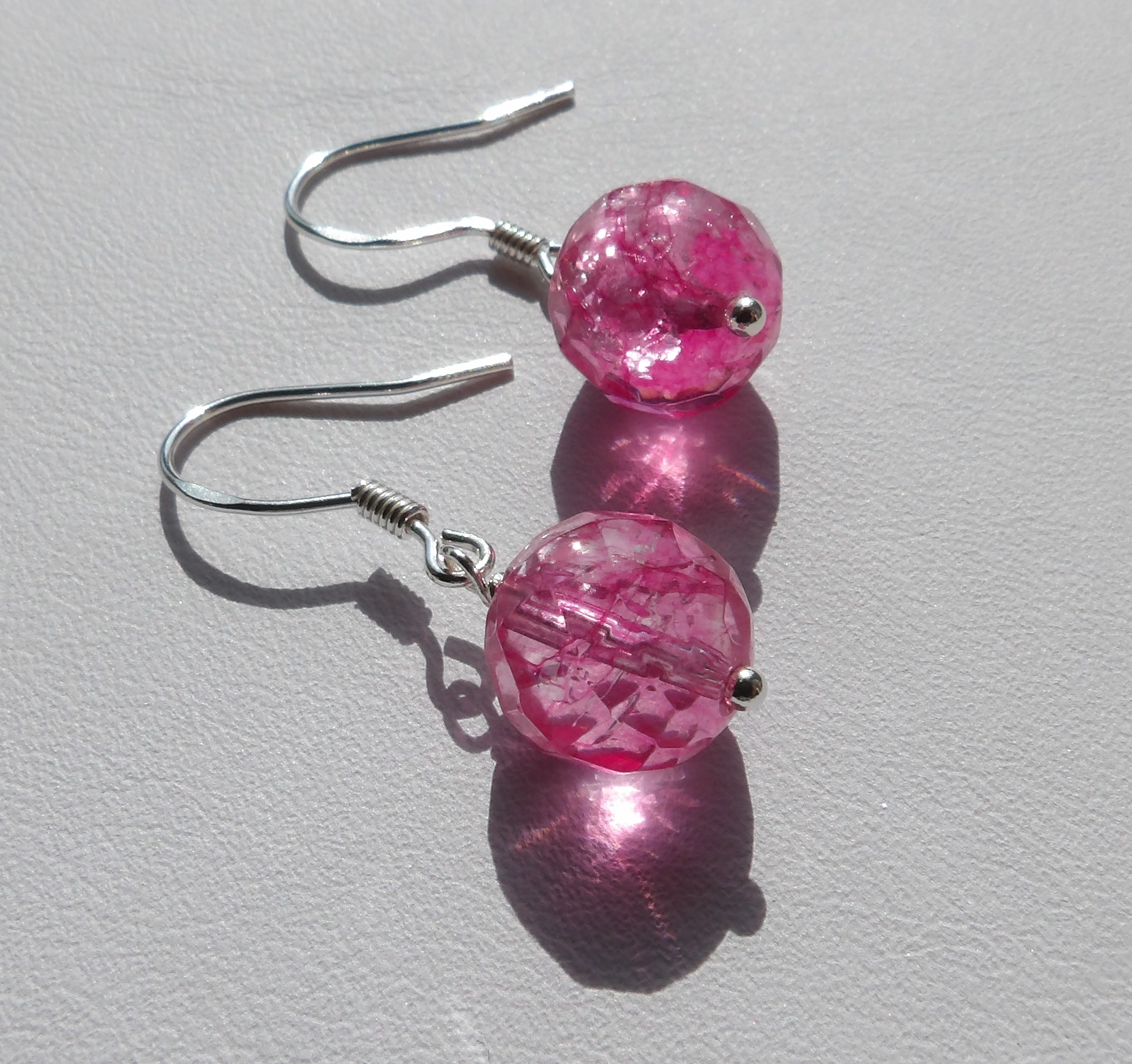 These earrings are made with lovely pink quartz rounds (10mm). The stones are faceted, which makes them very sparkly when light hits them, and attached to sterling silver shepherd’s hooks. Matching bracelet is available.