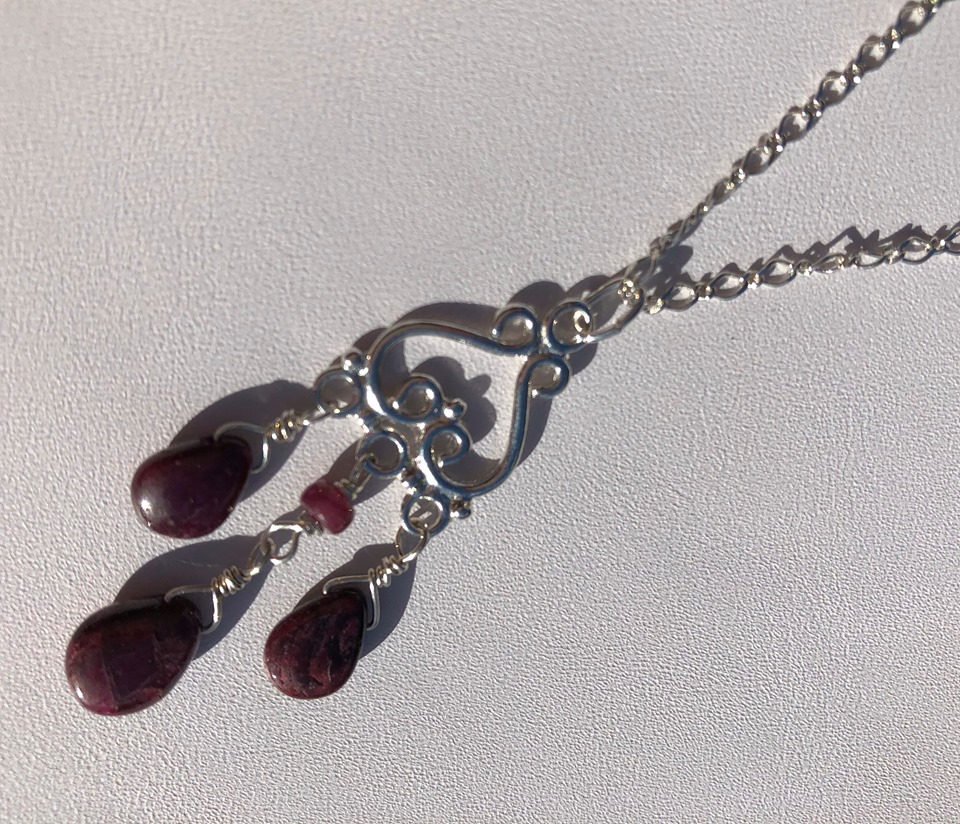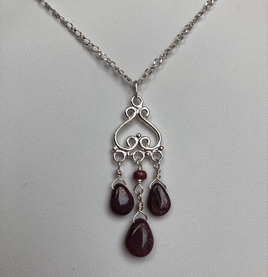 This pendant is made with three drop-shaped rubies and a rondelle ruby, attached to a sterling silver pendant. The sterling silver chain can be delivered at any length between 38cms and 66cms. Matching earrings are available.