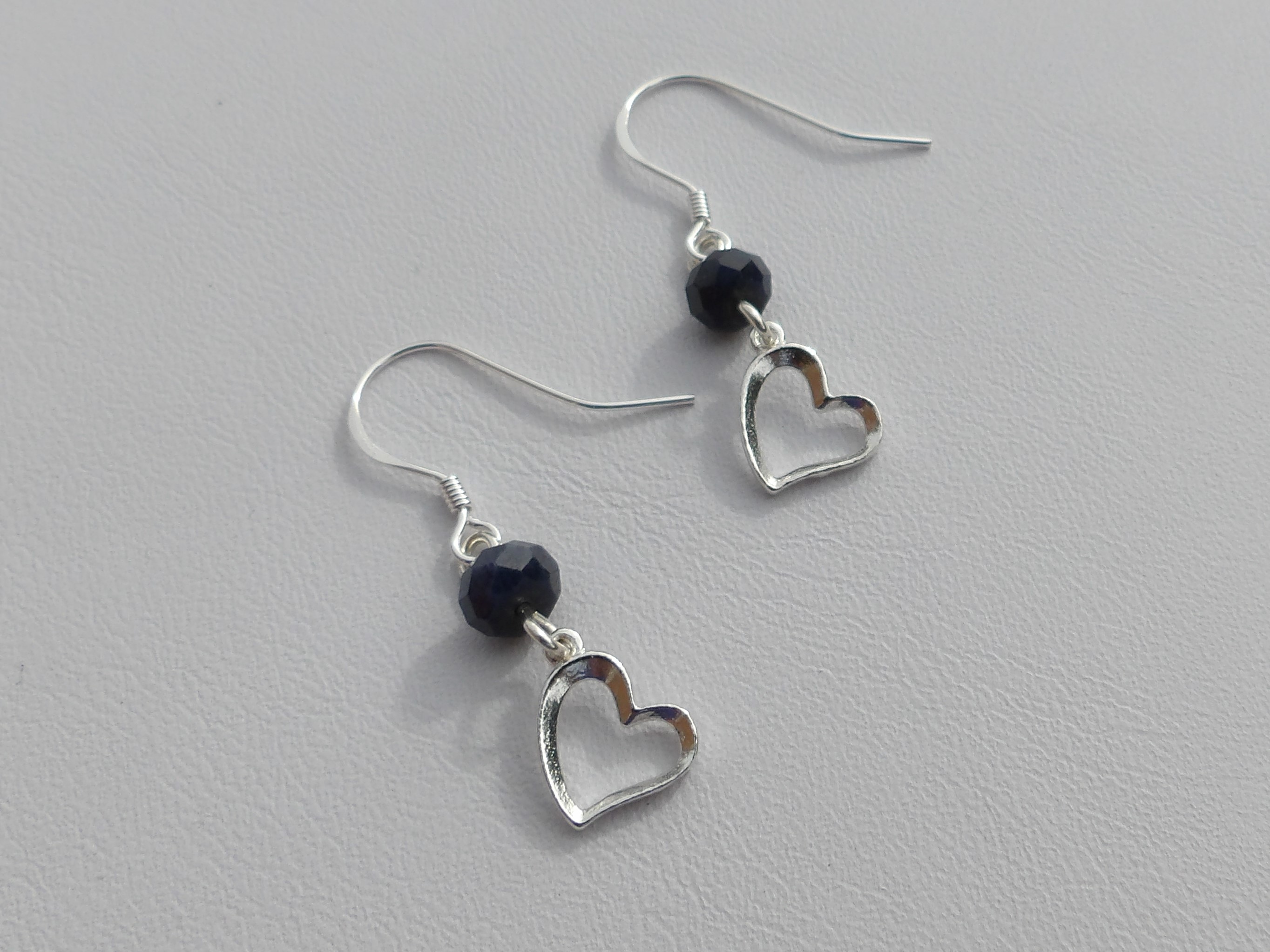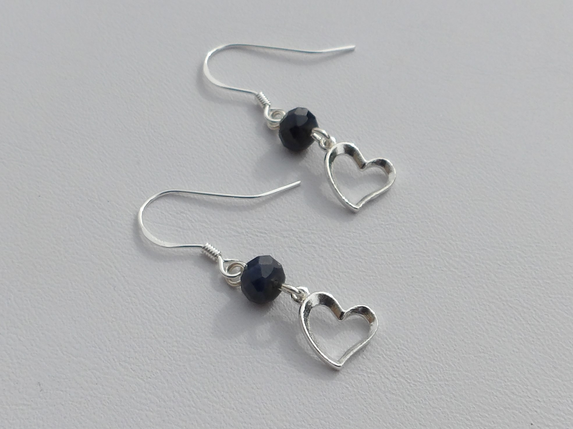 These pretty earrings are made with faceted sapphire rondelles and sterling silver hearts. The ear wire (shepherd’s hook) is also sterling silver.