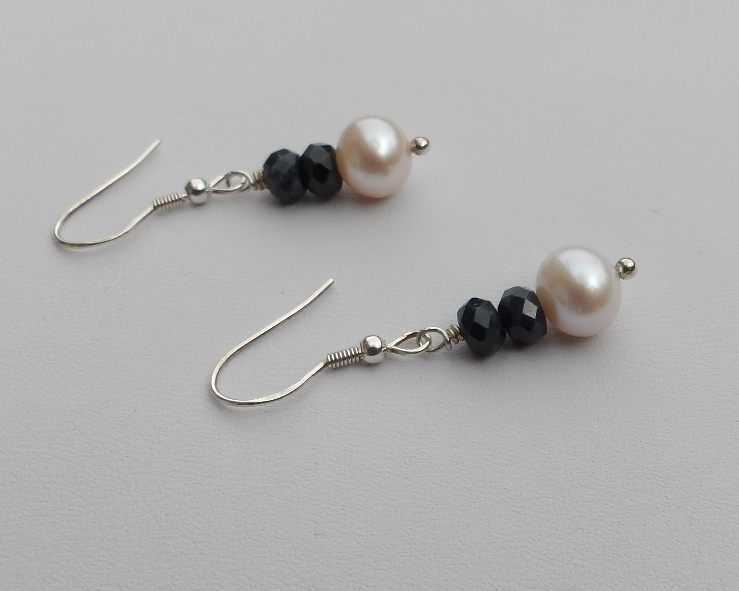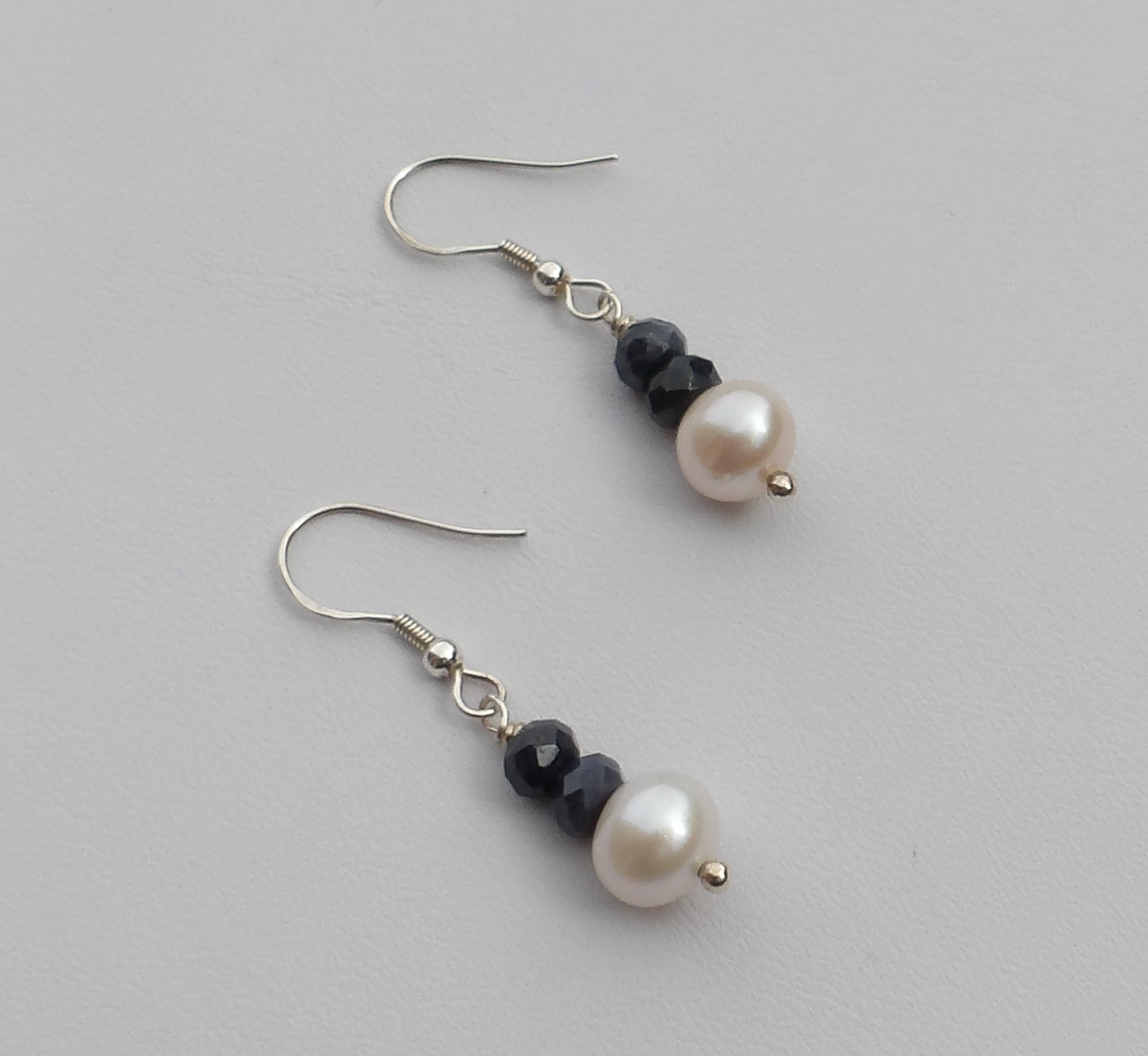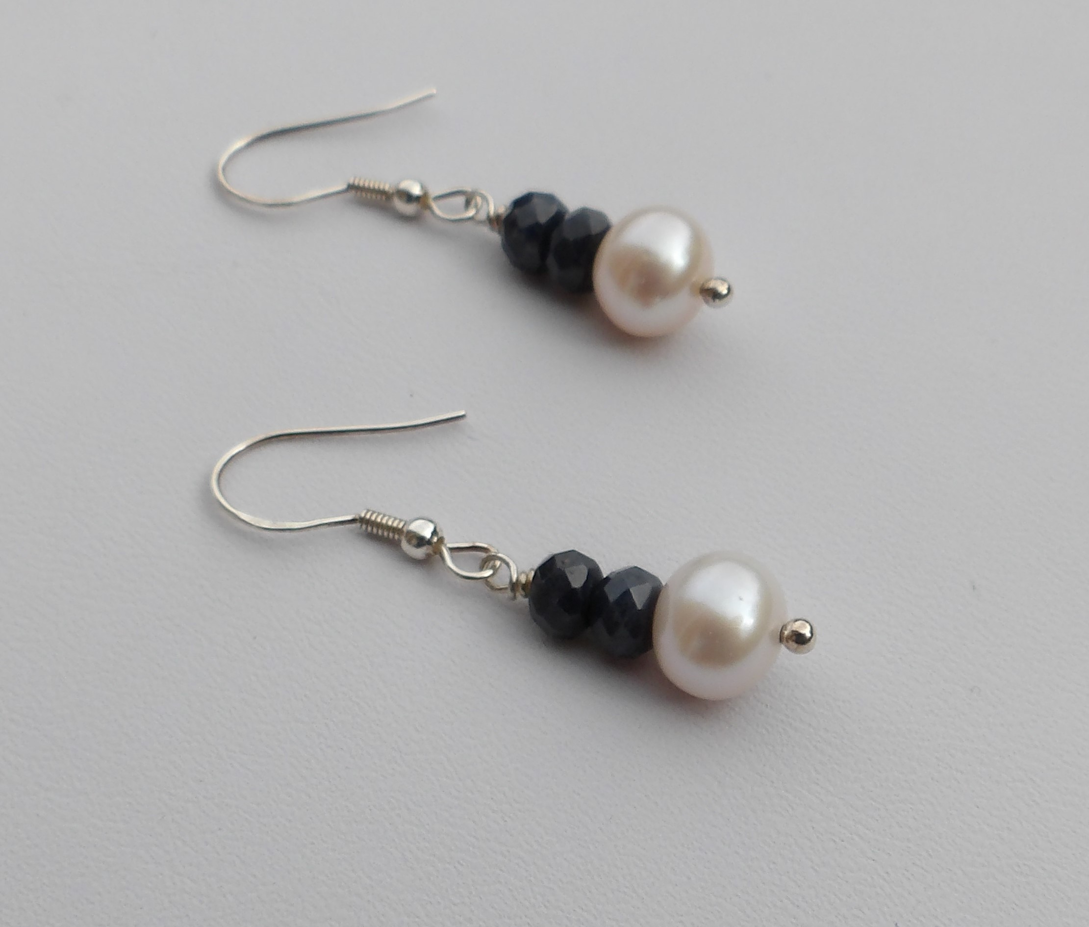 I’ve teamed a single freshwater pearl with two sizeable sapphire rondelles for these lovely earrings.The faceted sapphires sparkle when light hits them. The earrings look lovely on their own or with the matching pendant.