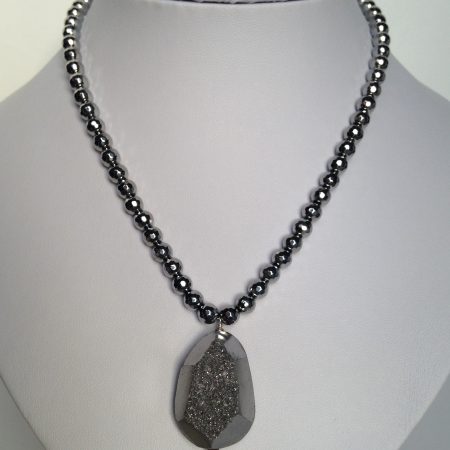 If you like sparkle, this necklace might be for you. The silver-coated quartz druzy pendant (about 20x30mm) twinkles like stars in the sky and the silver-coated agate rounds (6mm) glisten beautifully, thanks to the facets. The necklace is finished with a sterling silver extension chain and measures 16-17.5 inches (41-44.5 cms).