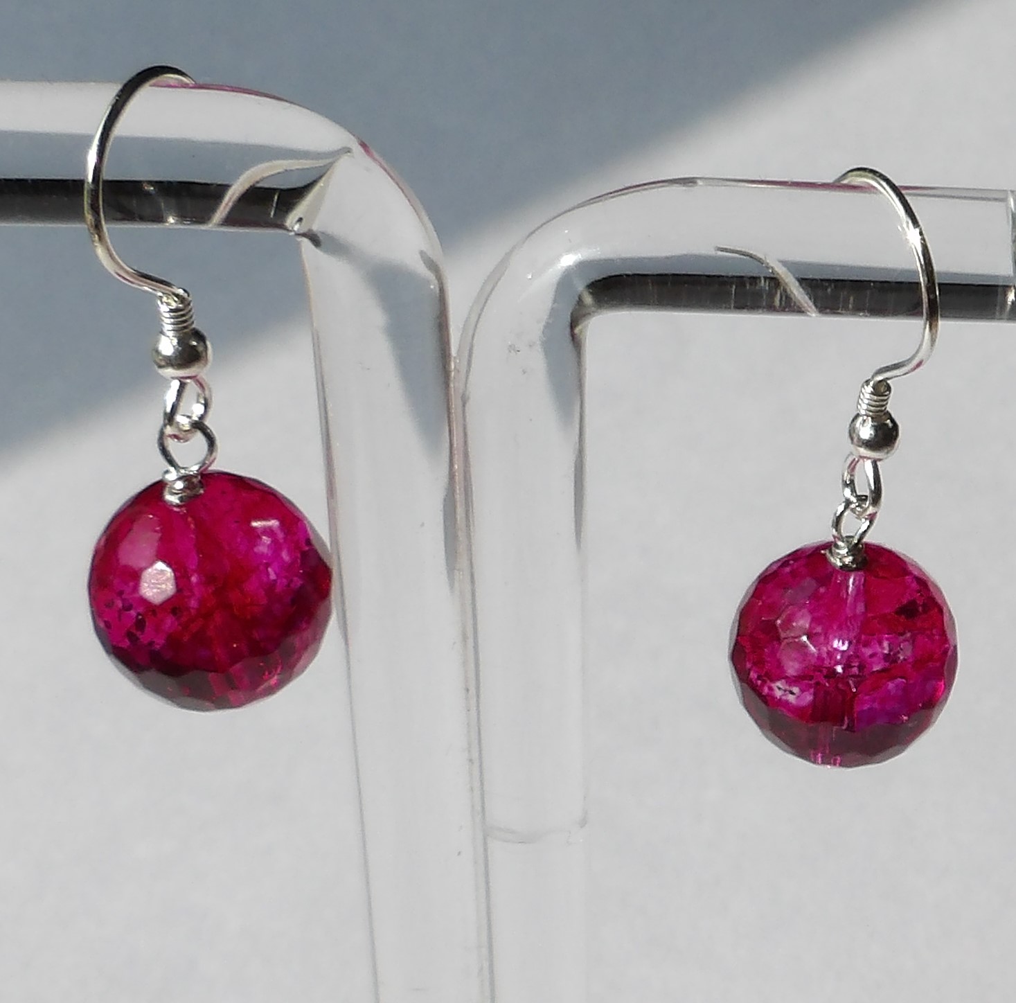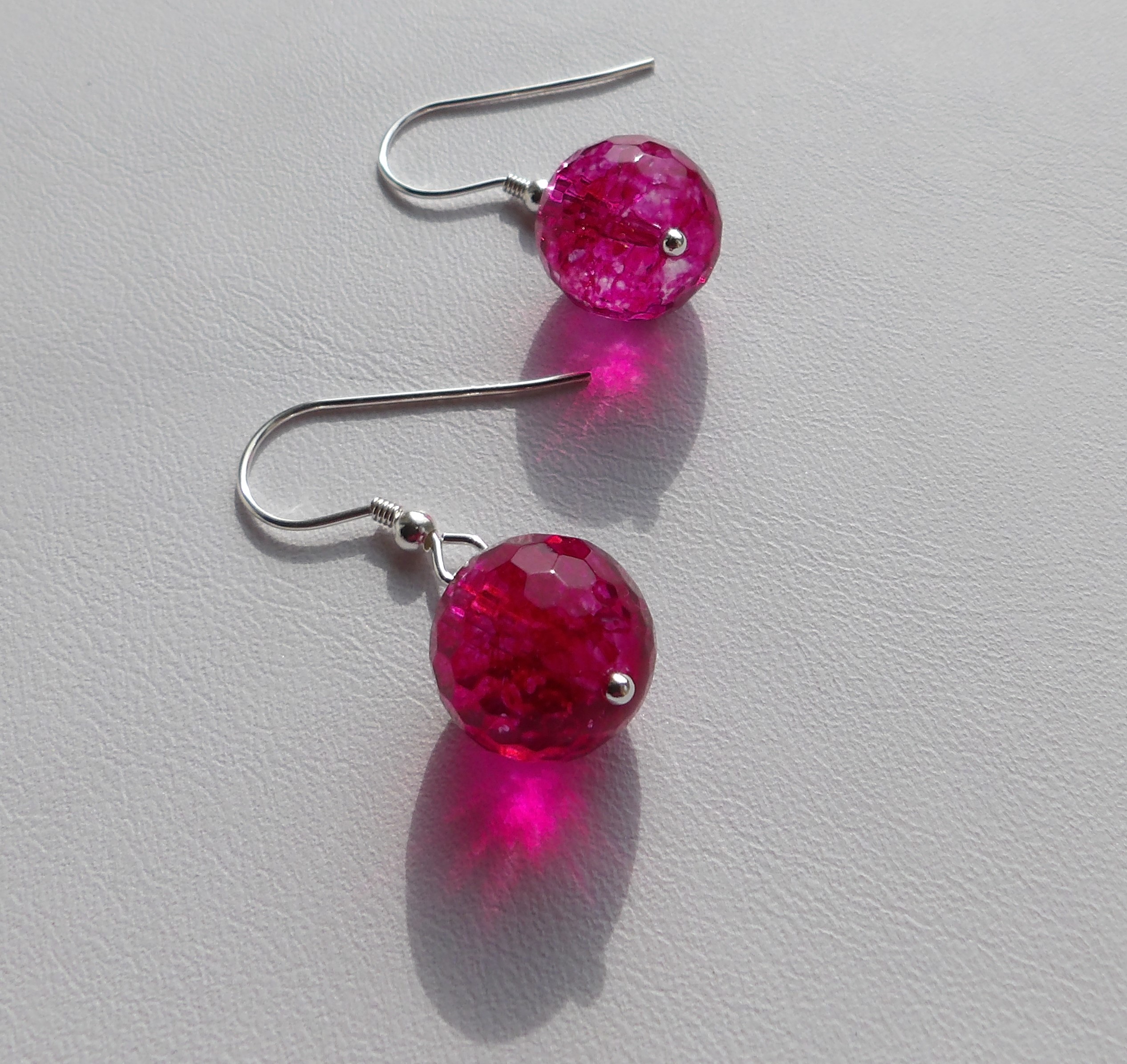 These earrings are made with beautiful and sparkly pink (dyed) quartz and sterling silver shepherd’s hooks. The 12mm rounds are faceted. Matching necklace is available.