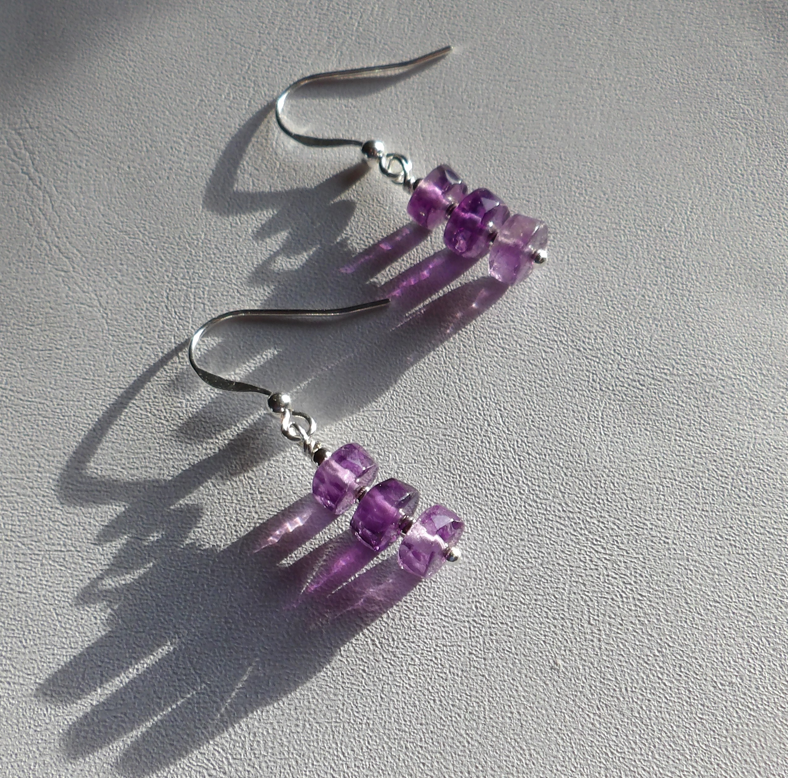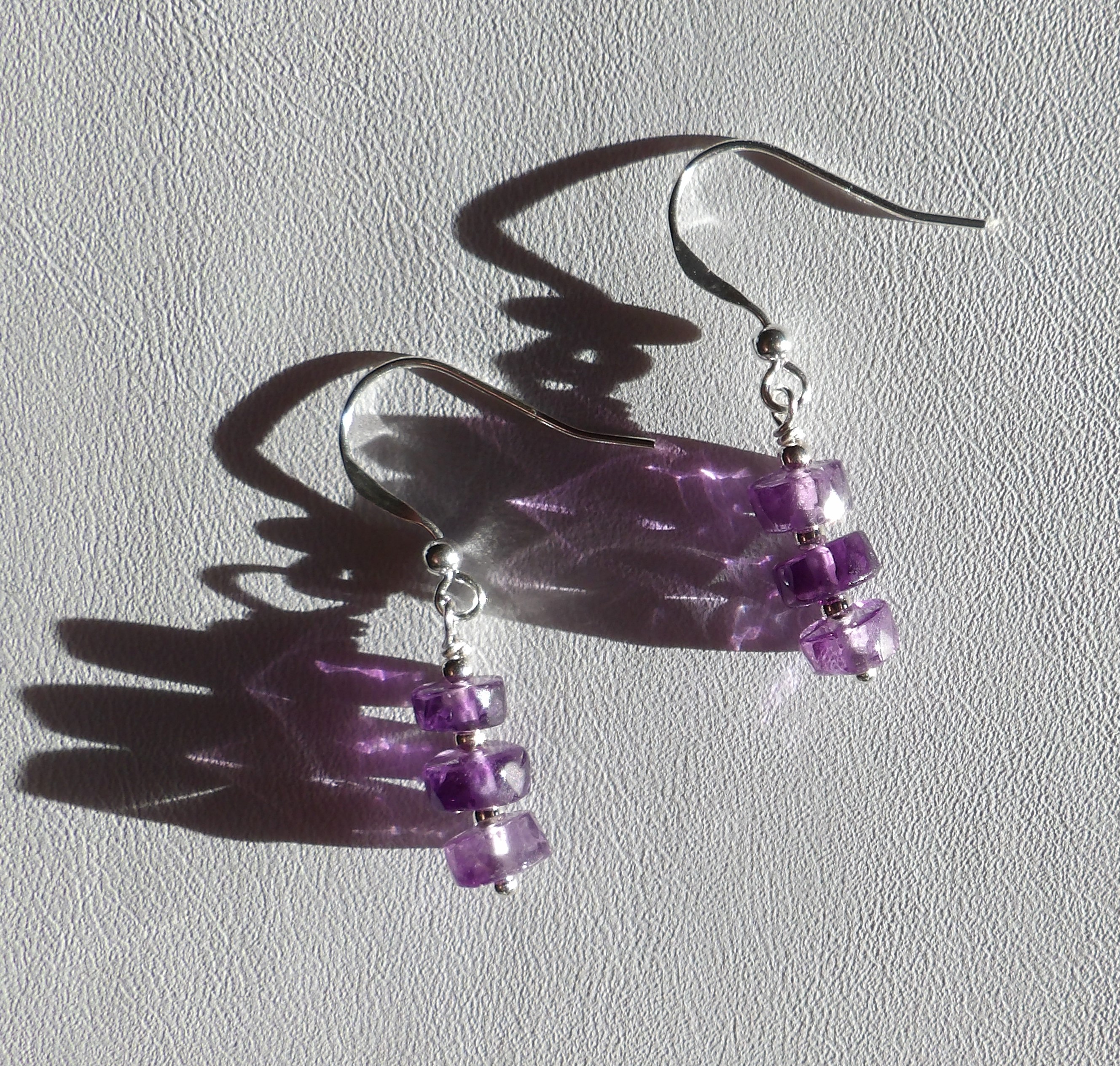 These pretty earrings are made with faceted amethyst rondelles separated by sterling silver beads. The shepherds hooks are also in sterling silver. Matching bracelet is available.